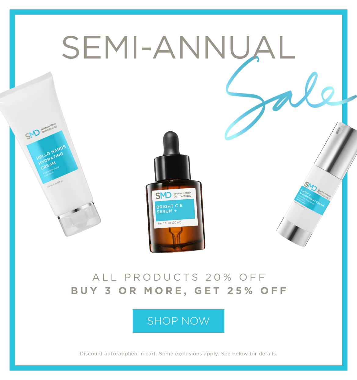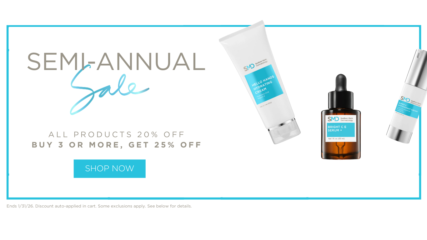 SEMI-ANNUAL SALE TERMS & CONDITIONS: All Southern Marin Dermatology branded skincare is 20% off, or 25% off when you buy 3 or more products. Valid in-office or online at. Excludes deluxe miniature sizes, services, Latisse, medical prescriptions including Even Glow Lotions or Pads, and Plated Skin Science. Discount will auto-apply in cart and cannot be combined with subscription savings. Ends 1/31.
